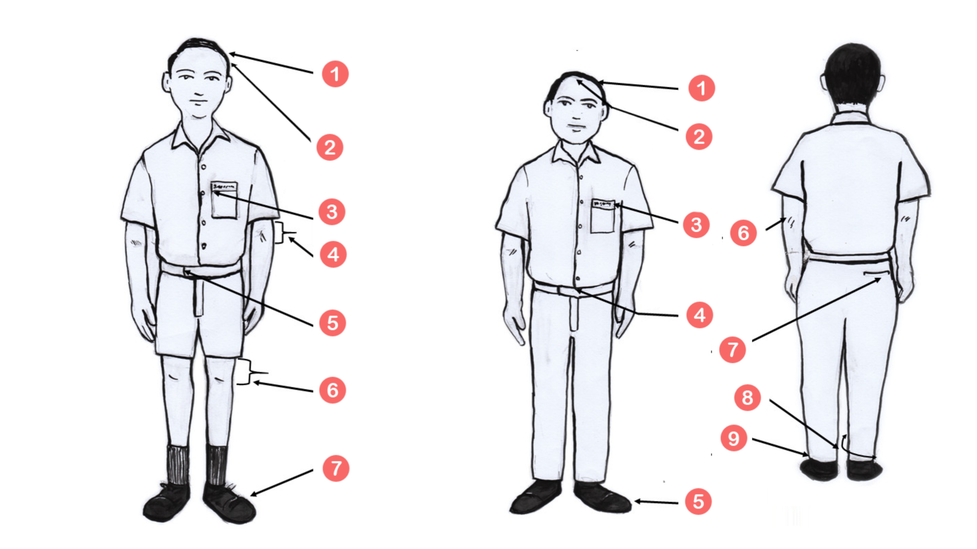 3.5 කමිසයේ වම් පස සාක්කුව පමණක් තිබිය යුතුය. ඇතුලු පැත්තට සාක්කු මැසූ කමිස ඇදිමද,සාක්කුවක් නොමැති කමිස ඇදිමද නොකල යුතුය.